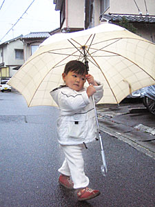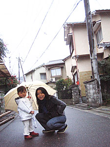 雨の中遊んでるのは、ジッチャンが庭に木と石を運び込んでいるから。